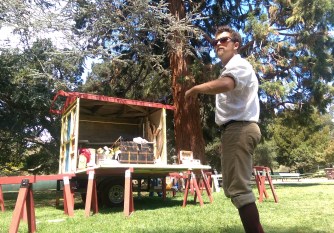 Samuel Peaches’ Peripatetic Players arrived in the Bay Area in Fall, 2013, with a trunkload of tall tales of world travel. Since then they have performed at theatres, schools, parks, and public spaces around the Bay Area, usually aboard FluxWagon, their folding mobile stage.