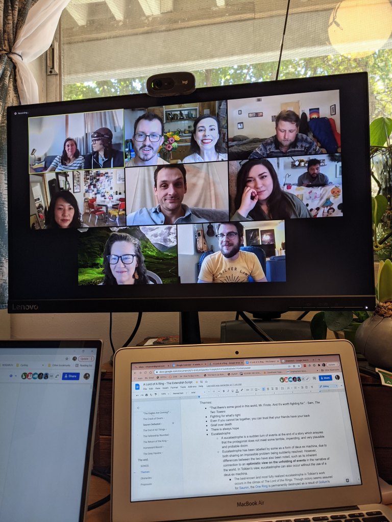 Throughout 2020 and 2021, Marlene (Princess Gwen) started adapting The Two Towers and The Return of the King. With the help of friends near and far (and the power of ZOOM!), we hosted a private online reading of this version (Version 2) of the script. This reading was incredibly helpful, showing us where big thorns were, and where moments of delight happened. Without the help of our friends, we wouldn’t be where we are today: hosting auditions for our production, under-going another major rewrite (Version 4!), and standing on the precipice of actual rehearsals!