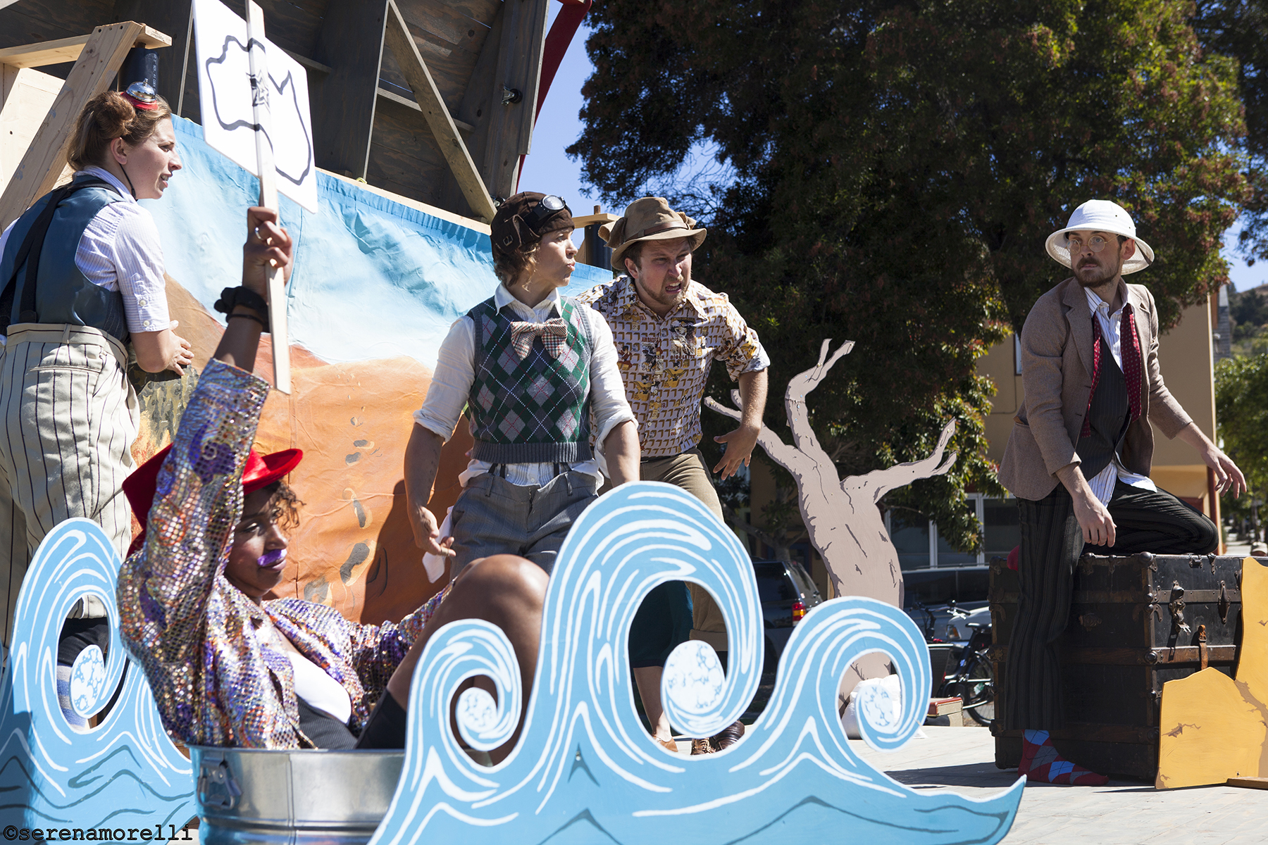 Thumper (Joan Howard) jumps high to escape the Dingo, played by Samuel Peaches (Casey Robbins), in O BEST BELOVED at Noe Valley, August 2014. Photo by Tim Guydish.O BEST BELOVED at Centennial Park, Pleasanton, August 2014. Photo by Rebecca Longworth.A Mariner (Sam Bertken as Meekins), Stute Fish (Sam Jackson as Blueberry Starshine) and Whale (designed by Megan Hillard) in O BEST BELOVED, August 2014. Photo by Serena Morelli.The Samuel Peaches Peripatetic Players in O BEST BELOVED at Noe Valley Town Square, August 2014. Photo by Tim Guydish.Thumper (Joan Howard), Princess Gwen (Marlene Yarosh), Meekins (Sam Bertken) and Arby Darby (Juliana Frick) in O BEST BELOVED at Precita Park, San Francisco, August 2014. Photo by Serena Morelli.The Samuel Peaches Peripatetic Players in O BEST BELOVED, August 2014. Photo by Serena Morelli.Player Emeritus, Blueberry Starshine (Sam Jackson), with some audience members at Precita Park, San Francisco, August 2014. Photo by Serena Morelli.
