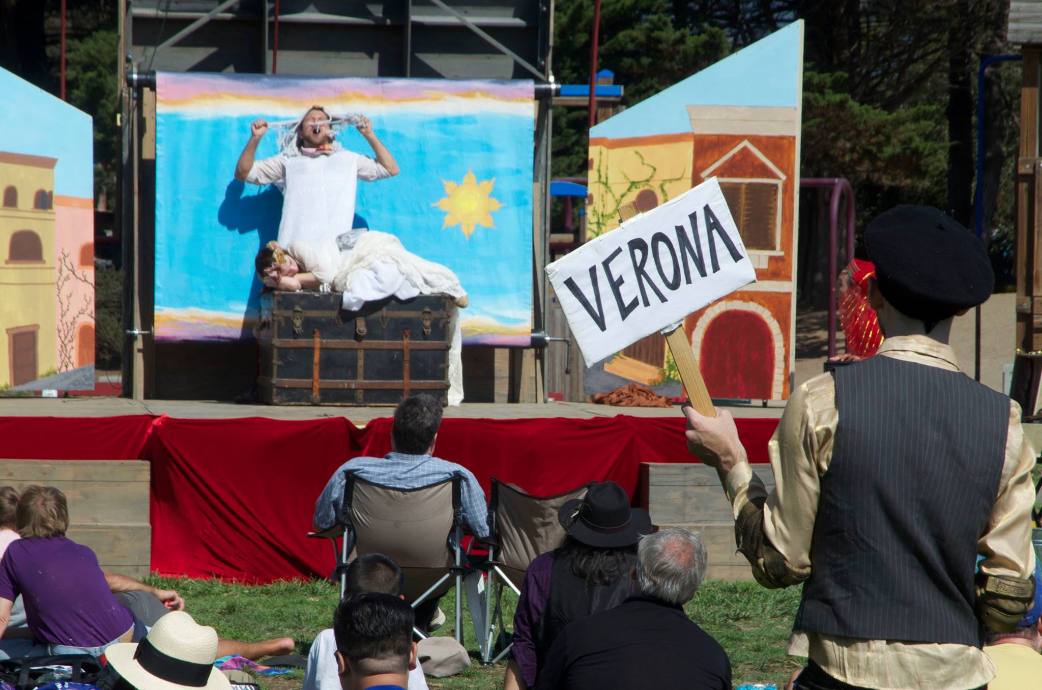 Thumper (Joan Howard) and Meekins (Sam Bertken) stage an intergalactic battle through the streets of Verona in Shakespeare or Space Wars. Photo by Tim Guydish.Samuel Peaches (Casey Robbins) as Obi-Wan Peachobi uses mind tricks to elude a Storm Trooper played by Princess Gwen (Marlene Yarosh). Guy Hank (Paul Collins), playing Lank Guywalker, watches in amazement. Photo by Tim Guydish.Samuel Peaches (Casey Robbins) plays Juliet’s Nurse in a scene from Shakespeare or Space Wars also featuring Princess Gwen (Marlene Yarosh) as Juliet and Guy Hank (Paul Collins) as Lady Capulet. Photo by Tim Guydish.Obi-Wan Peachobi (Casey Robbins) faces off against Darth Thumper (Joan Howard) in Shakespeare or Space Wars. Photo by Tim Guydish.Samuel Peaches (Casey Robbins) pulls out all the emotional stops as the Nurse, who must discover the seemingly-deceased Juliet, played by Princess Gwen (Marlene Yarosh). Photo by Tim Guydish.Meek3PO (Sam Bertken), Lank Guywalker (Paul Collins), Obi-Wan Peachobi (Casey Robbins) and Thump2D2 (Joan Howard) travel by pantomime in a scene from Shakespeare or Space Wars. Photo by Tim Guydish.The Peripatetic Players enact a famous scene involving a trash compactor in Shakespeare or Space Wars. Photo by Tim Guydish.The Peripatetic Players in a Veronese scene from Shakespeare or Space Wars at the Berkeley Marina, September 2016. Photo by Rebecca Longworth.