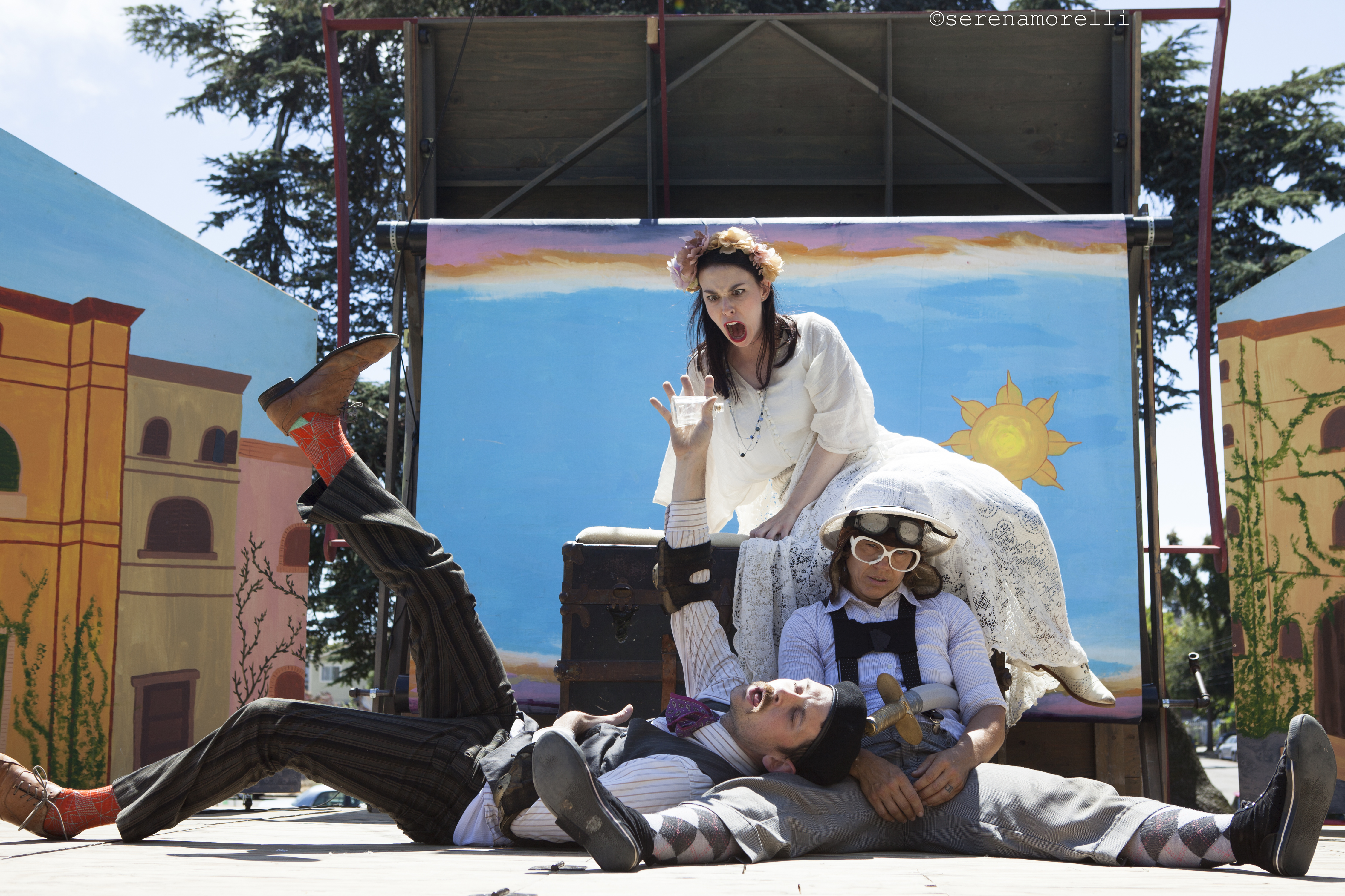 Thumper (Joan Howard) as Paris — a man of wax! — with Madame Directrix (Rebecca Longworth) as Lady Capulet and Samuel Peaches (Casey Robbins) as the Nurse, discussing the nuptial fates of Princess Gwen (Marlene Yarosh) as Juliet in the Peripatetic Players’ 2015 spontaneous adaptation of Romeo and Juliet at Port Costa’s Bull Valley Roadhouse. Photo by Danielle Gray.